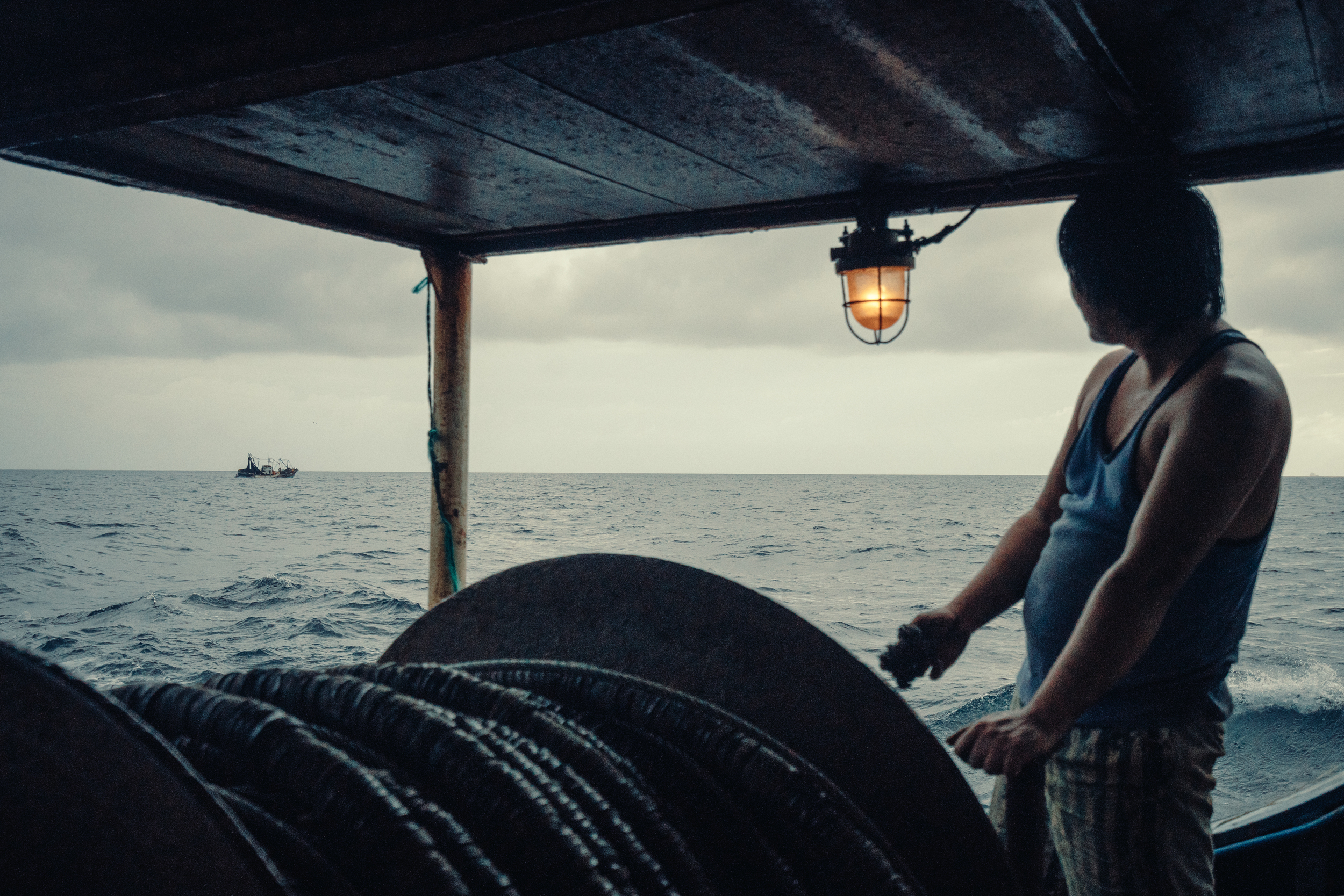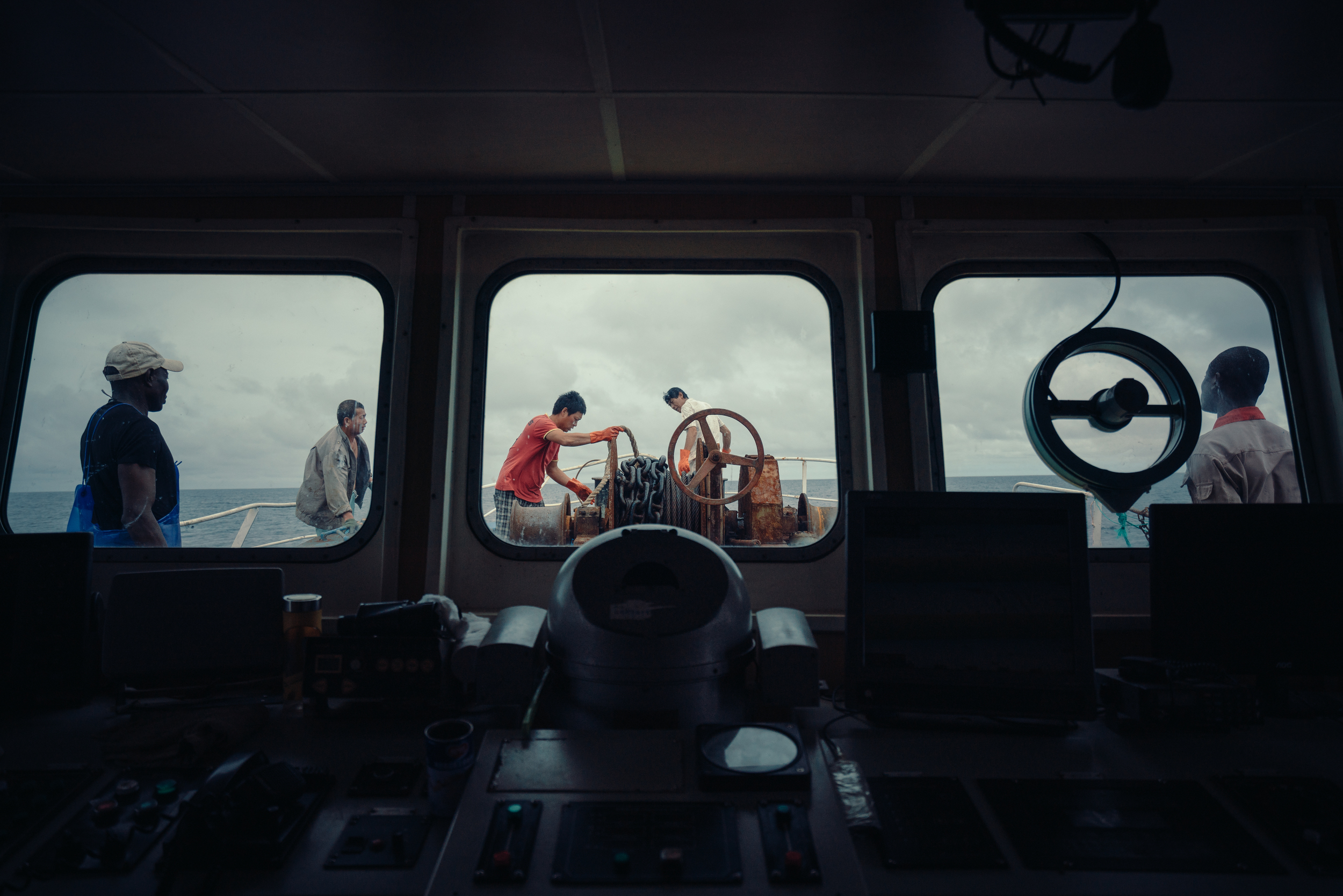大西洋几内亚比绍海域。渔船经过一天的航行到达作业区域,船员们正在收锚,准备开始捕鱼。图片来源:Liu Yuyang / Greenpeace
