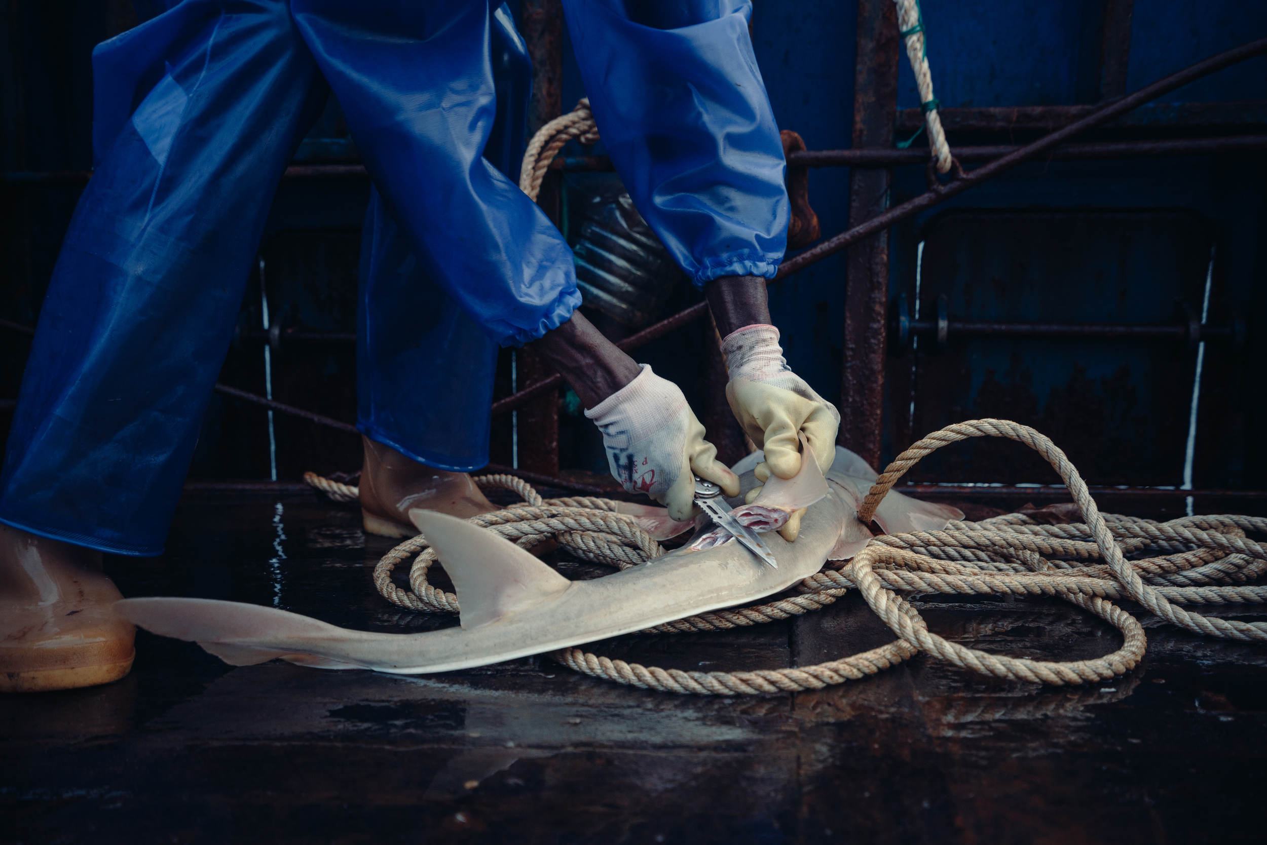 一位船员正在割一条犁头鳐的鱼鳍。鳐鱼与鲨鱼同属软骨鱼类,有些犁头鳐被认为肉质不佳,但鱼鳍常被制成鱼翅出售,因此在渔船上被割鳍弃身。图片来源:Liu Yuyang / Greenpeace